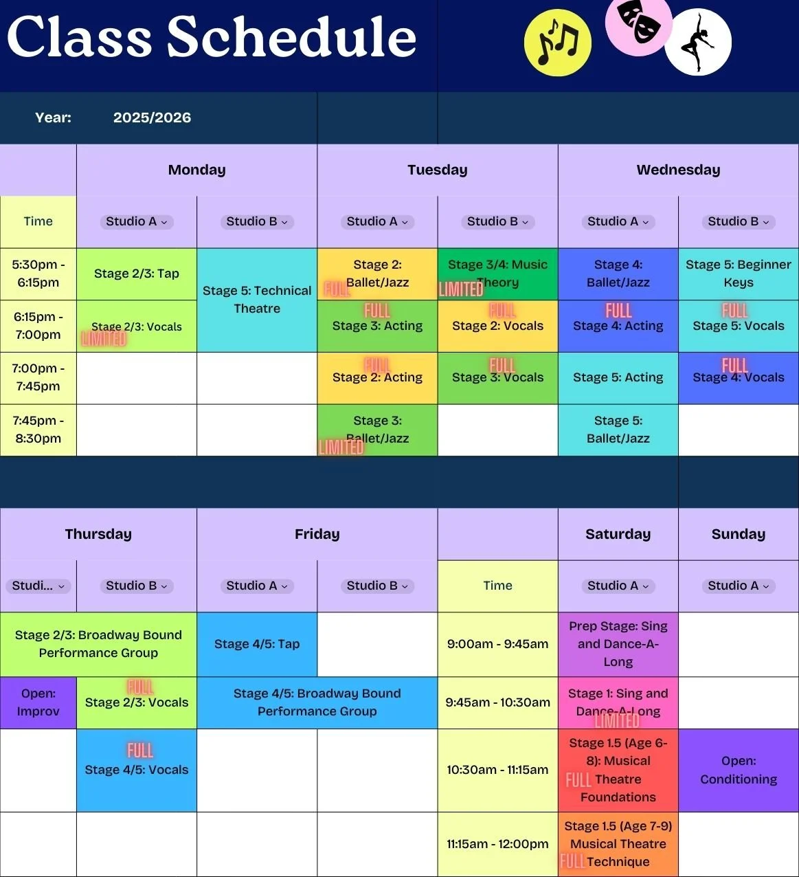 Broadway Bound is for students in Stages 2-5. Invitation letters to join this program will be sent to current students by April 15th.